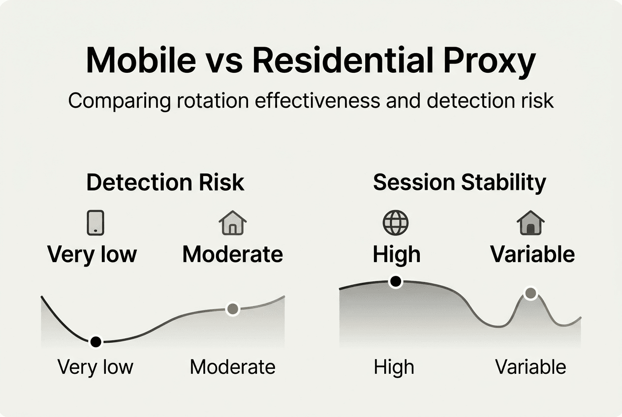 The choice between datacenter vs mobile proxies fundamentally determines rotation strategy success. Mobile IPs support longer session durations and higher request volumes per IP before triggering rate limits, reducing the frequency of required rotations and simplifying infrastructure management.